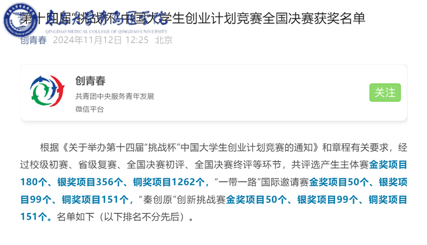“挑战杯”中国大学生创业计划竞赛每两年一届,已成为覆盖全国所有高校、面向全体高校学生、影响最大的赛事活动之一,本届大赛由共青团中央、教育部、人力资源社会保障部、中国科协、全国学联、陕西省人民政府等单位共同主办,西安交通大学、共青团陕西省人民政府承办。自2024年6月国赛启动以来,吸引了来自全国2700余所高校的300多万名学生参与,累计提交了39万余个创新创业项目。青岛大学青岛医学院在本届大赛中的出色表现,展示了我院在学科建设和人才培养方面的深厚积淀,充分体现了广大青医学子的创新精神和实践能力。未来,青岛医学院将继续以各类创新创业竞赛为重要抓手,鼓励支持有潜力的项目实现落地转化,培养拔尖创新医学人才,为推动青大医学的高质量发展作出更大的贡献。