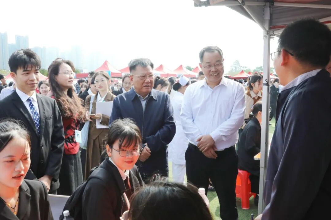 当天上午,自治区教育厅二级巡视员、高校学生处处长汪维到现场调研指导。我校领导马献力、曾小云、覃克强、陈健等到现场了解用人单位岗位需求情况、毕业生应聘情况,与用人单位代表和学生亲切交流。在双选会现场,校领导们听取用人单位对我校人才培养质量、学生就业情况等方面的建议,深入了解毕业生就业意愿及应聘中遇到的困难。校党委书记马献力要求,学校各院系、各部门要加强校内外协同合作,共同形成支持毕业生就业的良好局面。