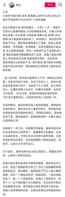 #网传国足冲场球迷发文回应# 从小自卑、大专休学失去信心