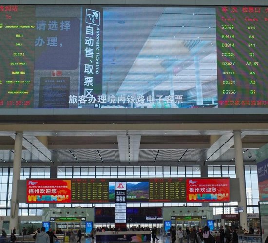 12月1日,在广西南宁市南宁东站,记者看到车站大屏幕上,铁路电子客票服务宣传片正在滚动播放。