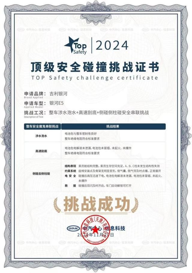 在多方见证下,吉利银河E5顺利通过此次全面超越国标标准、模拟用户真实用车极端环境的串联试炼,并获颁TOP Safety中国汽车顶级安全碰撞挑战证书,铸就10万级纯电安全最高标准。在官宣上市119天交付量超6万辆不久,吉利银河E5顺利通过串联试炼,无疑在向用户释放其是10万级最安全纯电SUV的信号,将激发“银河速度”新一轮提升动能。