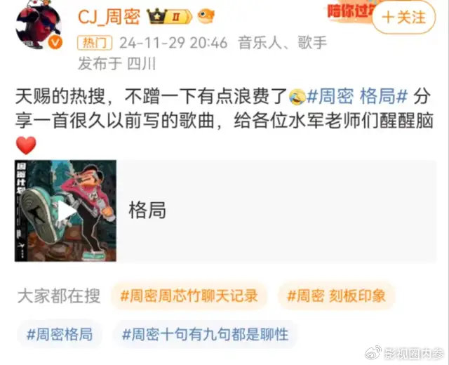 事åŽï¼Œå‘¨å¯†åˆå‘å‡ºè‡ªå·±æŒæ›²ã€Šæ ¼å±€ã€‹çš„å¾®åšæ¥å›žåº”,并称“天èµçš„çƒæœï¼Œä¸è¹ä¸€ä¸‹æµªè´¹äº†â€ï¼Œç–‘似在内涵周芯竹。这也引æ¥ä¸å°‘网å‹åœ¨å…¶è¯„论区é”评“全世界最该å¬è¿™é¦–æŒçš„äººå°±æ˜¯ä½ â€ã€‚ä¸å¯¹èŠå¤©è®°å½•ä½œå‡ºå›žåº”ï¼Œå´æ¨¡æ£±ä¸¤å¯å‘æŒåšçƒåº¦ï¼Œç”šè‡³å†…涵女方找水军,周密æ¤ä¸¾è®©ç½‘å‹ç›´å‘¼ä¸ç†è§£ã€‚