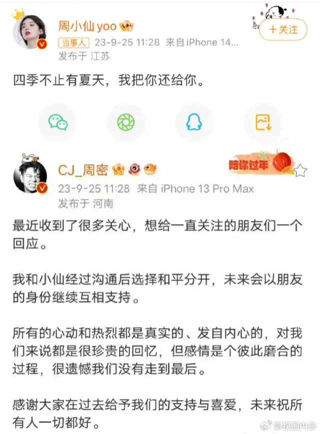 两人在2023å¹´9月25æ—¥å®£å¸ƒåˆ†æ‰‹ï¼Œå‘¨å¯†å‘æ–‡è¡¨ç¤ºâ€œæ‰€æœ‰çš„心动和çƒçƒˆéƒ½æ˜¯çœŸå®žçš„ã€å‘自内心的,但感情是个彼æ¤ç£¨åˆçš„è¿‡ç¨‹ï¼Œå¾ˆé—æ†¾ä»–们没有走到最åŽã€‚â€