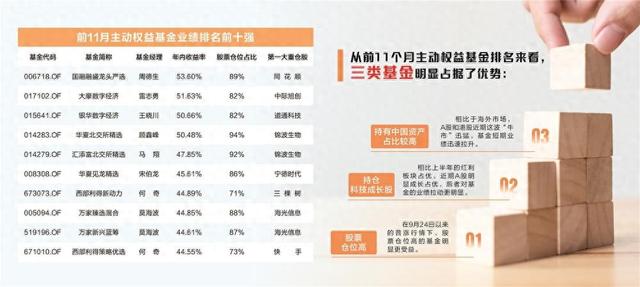随着股票市场今年由冷转暖,做多氛围从年初的红利逐步渗透到大部分成长赛道,赚钱效应在9月底以来在绝大部分基金业绩上得到体现。Wind数据显示,国融融盛龙头严选、大摩数字经济、银华数字经济位列前11个月内公募主动权益基金业绩三甲,年内收益率分别达到53.60%、51.63%、50.66%。