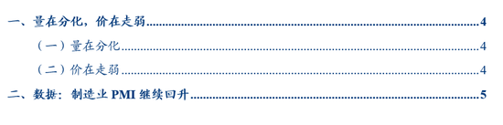 11æœˆï¼Œå°½ç®¡åˆ¶é€ ä¸šPMI进一æ¥ä¸Šè¡Œï¼Œä½†ä¸Ž10æœˆæ”¿ç–æŽ¨åŠ¨ä¸‹çš„å…¨é¢å›žæš–ä¸ä¸€æ ·çš„æ˜¯ï¼Œéƒ¨åˆ†é¢†åŸŸå¼€å§‹å‡ºçŽ°ä¸€äº›èµ°å¼±è¿¹è±¡ã€‚åŒ…æ‹¬é‡çš„层é¢ï¼ˆå»ºç‘业链æ¡ã€å±…民出行链),价的层é¢ï¼ˆåˆ¶é€ ä¸šå‡ºåŽ‚ä»·æ ¼ä¸Žé‡‡è´ä»·æ ¼ï¼‰ï¼Œå› 而,åŽç»æ”¿ç–èµ°å‘æˆ–仿˜¯å®è§‚æ ¸å¿ƒå…³æ³¨ç‚¹ã€‚