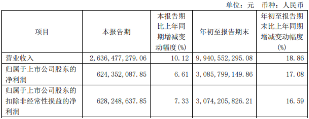 根据今世缘近日发布第三季度财报显示,公司前三季度实现营业收入约99.41亿元,同比增长18.86%;净利润约30.86亿元,同比增长17.08%。其中,第三季度实现营业收入约26.36亿元,同比增长10.12%;净利润约6.24亿元,同比增长6.61%。