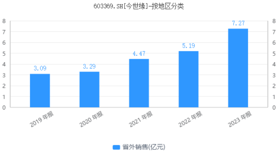 然而,自公司新的五年战略规划纲要发布以来,今世缘营收规模仍然保持了较快的增长,但这主要来自于省内市场,省外市场进展依旧不理想。数据显示,2021年-2023年,今世缘省外市场销售收入分别为4.47亿元、5.19亿元和7.27亿元,对应营收占比分别为7.02%、6.61%和7.2%,提升非常有限。