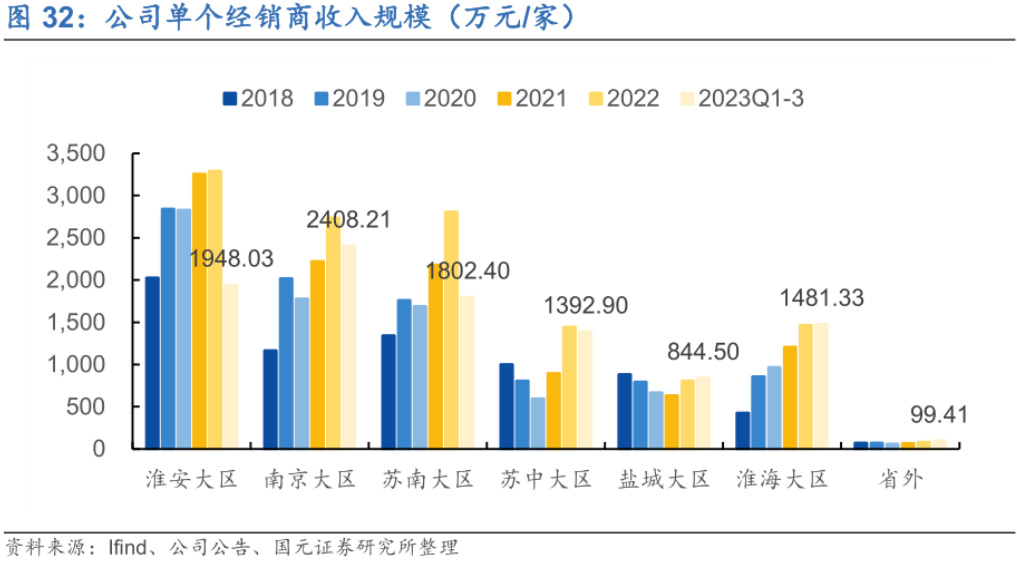 在渠道布局上,洋河股份在江苏省内采取深度分销的渠道策略,省内网点密集,但产品价格相对通明,经销商利润较低。为此,今世缘采取渠道高毛利的差异化营销策略,针对洋河的经销商网络给出了更高的渠道利润。例如,金世缘的国缘系列较洋河蓝色经典系列每瓶毛利高出2-15元,平均利润约为洋河的2倍,抢占了不少洋河股份的渠道资源。