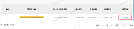 值得注意的是,据基金业协会官网显示,含德基金在11月22日进行了主动注销。