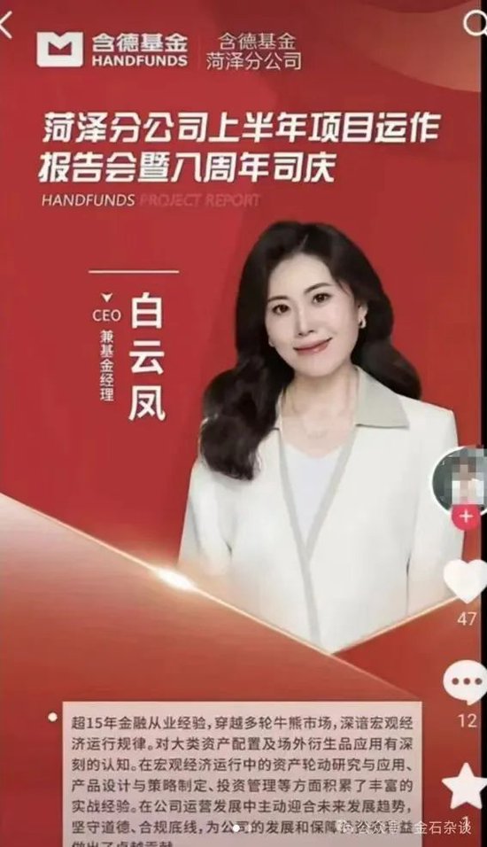 另据基金业协会官网,白云凤在2016年至2021年期间,任含德基金副总经理、首席运营官。此外,相关宣传海报显示,白云凤为含德基金菏泽分公司CEO兼基金经理。