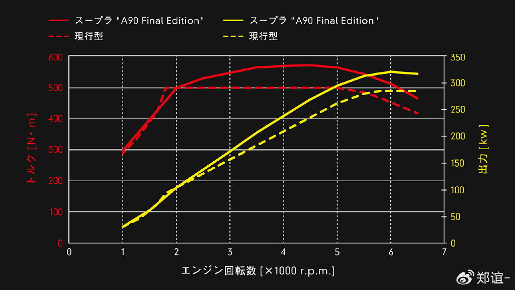 GR SUPRA A90 Final Edition 加强了输出。最大功率从原来的387马力提高到435马力,扭矩从51.0kgf·m提高到58.1kgf·m。