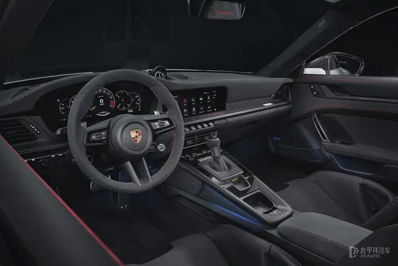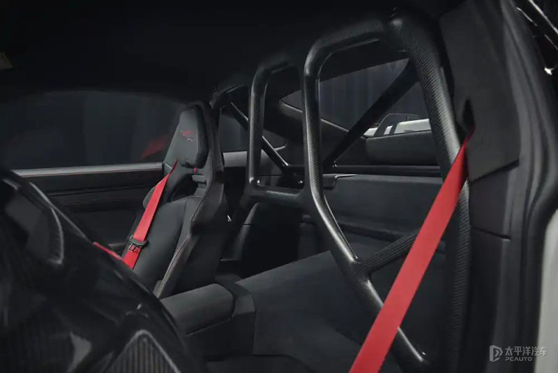 (旅行版)内饰方面,标配的黑色双座驾驶舱基于当前911车型的设计。不过,与Carrera车型不同的是,911 GT3不是通过按钮启动,而是仍然保留旋扭式点火装置开关。中间的数字仪表面板能够为驾驶员提供结构清晰的显示和操作概念。“赛道视图”显示模式将转速表左右两侧的数字显示有关轮胎、机油、水温和燃料的重要数据,并通过换档闪光向驾驶员指示最佳换档时间。最后新车选装翻滚防护杆,说明它是一台能“合法上路”的赛车。