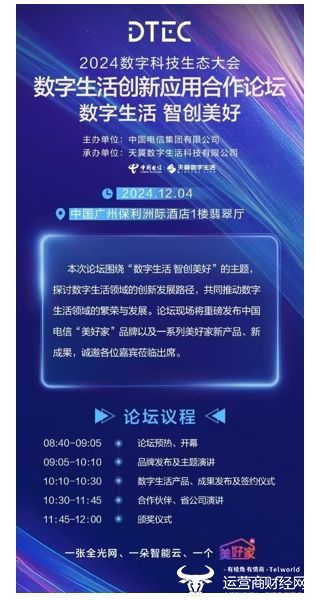 大会期间,以“数字生活 智创美好”为主题的数字生活创新应用合作论坛将于12月4日上午举办,该论坛旨在探讨数字生活领域的创新发展路径,共同推动数字生活领域的繁荣与发展。据悉,论坛现场将重磅发布中国电信“美好家”品牌以及一系列美好家新产品、新成果,让人期待值拉满!