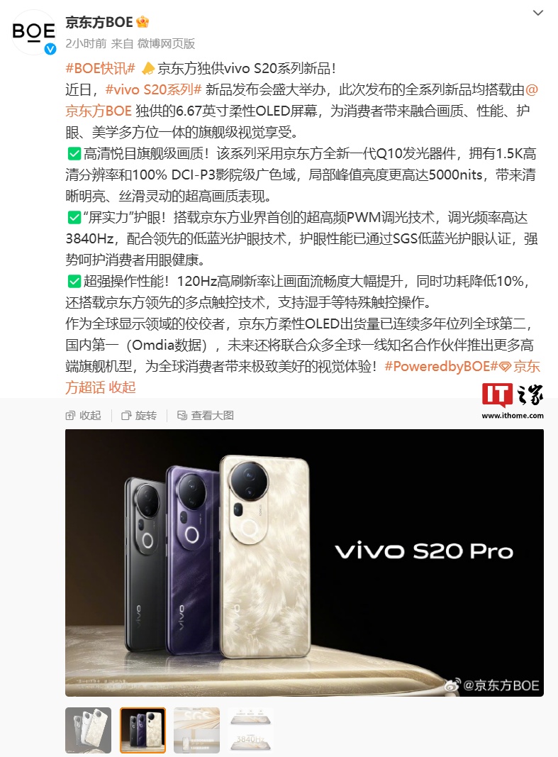 IT之家 12 月 2 日消息,京东方今日发文宣布独供 vivo S20 系列新品手机的 6.67 英寸柔性 OLED 屏幕。该款手机屏幕采用 Q10 发光器件、局部峰值亮度可达 5000nits。