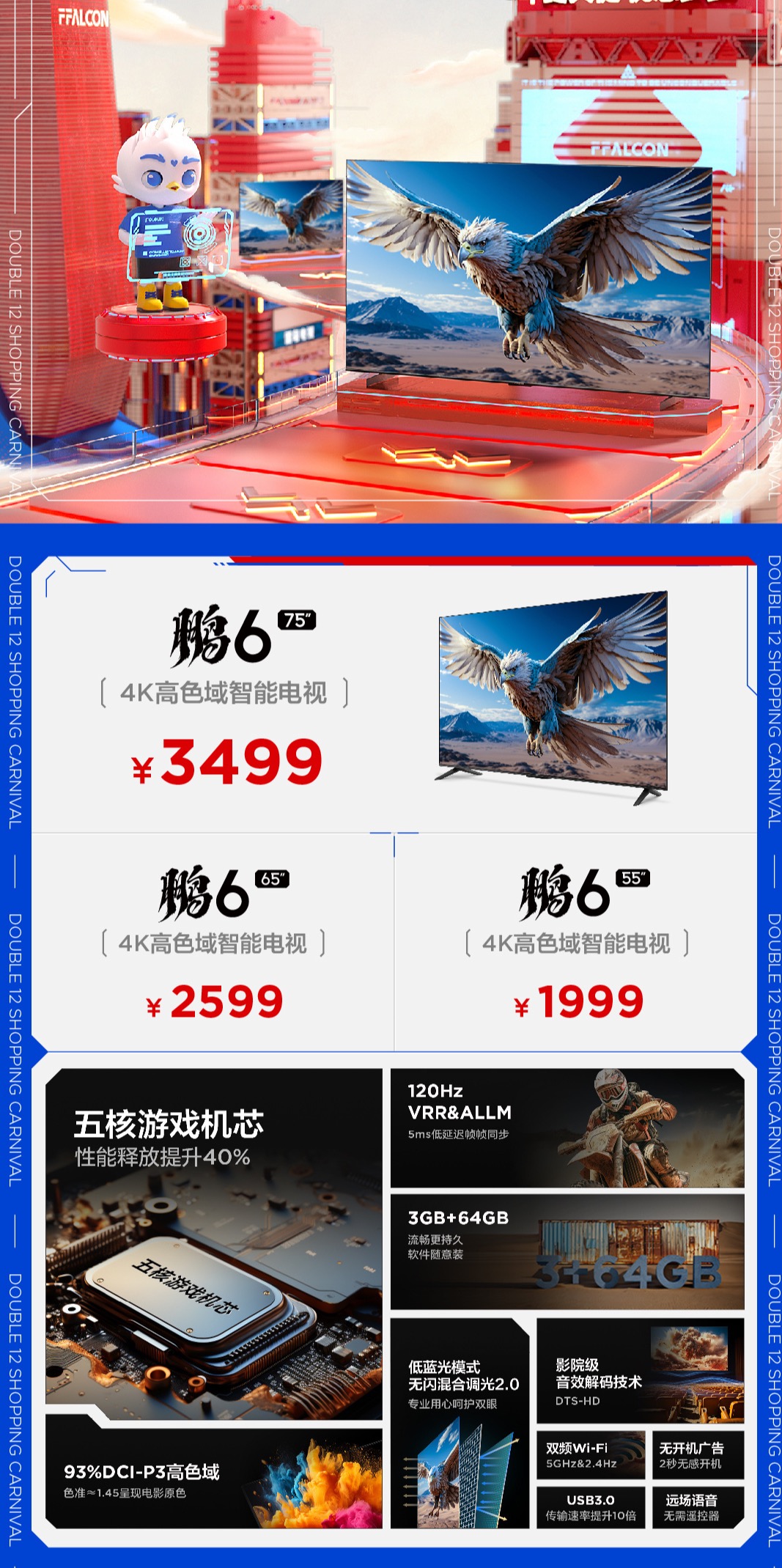 雷鸟鹏 6 24 款电视去年 12 月 12 日上市,采用 4K 120Hz 面板,55 英寸 1999 元,65 英寸 2599 元,75 英寸 3499 元。