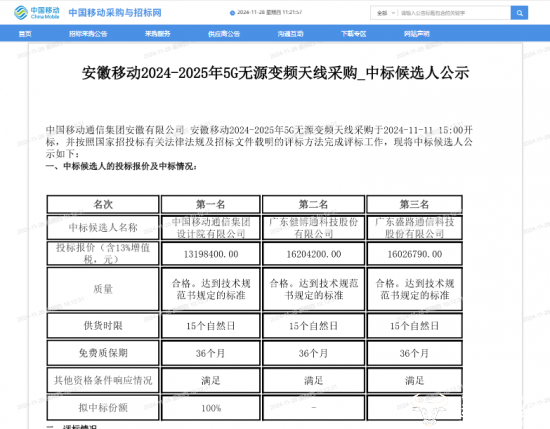 日前,安徽移动公布“2024-2025年5G无源变频天线采购”结果,中国移动通信集团设计院有限公司成功中标,但其他两家厂商服气吗?