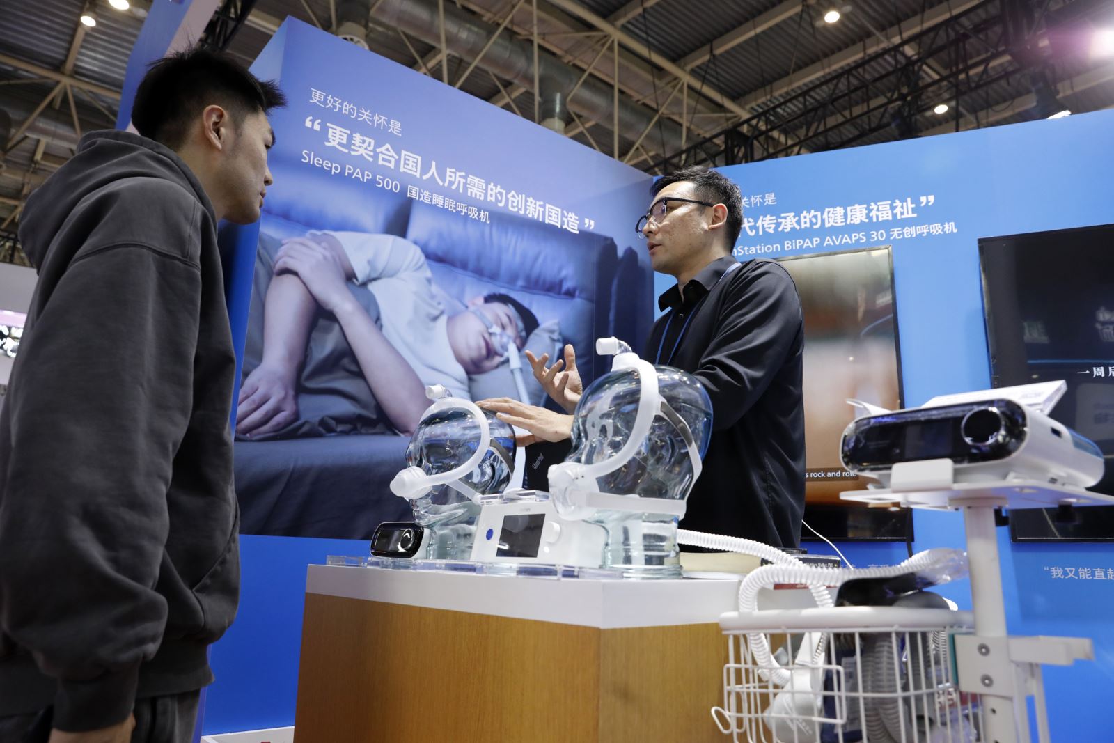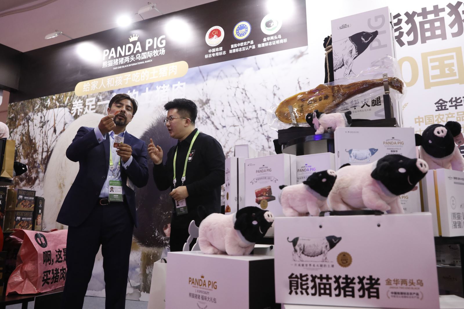 参展商为观众介绍来自浙江的地标产品“金华两头乌”