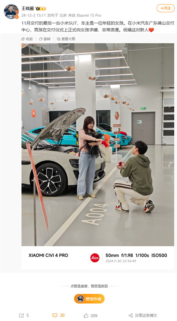 在小米汽车广东佛山交付中心,男孩在交付仪式上正式向女孩求婚,非常浪漫。