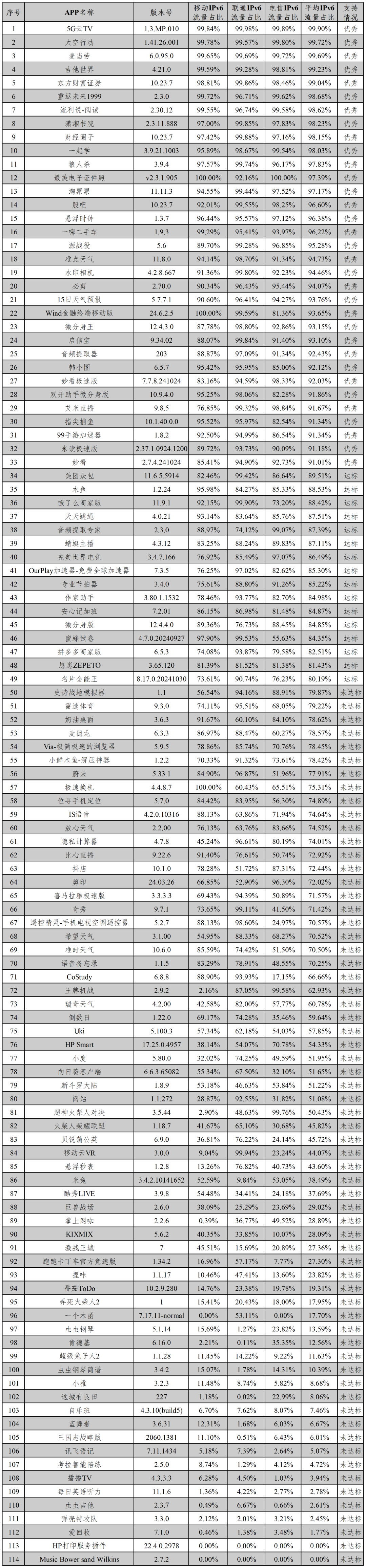 超神火柴人对决、阅站、新斗罗大陆等65款APP的IPv6流量占比低于80%,需加大放量引流力度。其中,Music Bower sand Wilkins、HP打印服务插件、爱回收、弹壳特攻队、虫虫吉他等33款APP的IPv6流量占比低于50%,改造进度滞后,运营企业需强化主体责任落实,加快完成IPv6升级改造。(新纳入监测的商业APP的IPv6支持情况测试结果详见附表4)