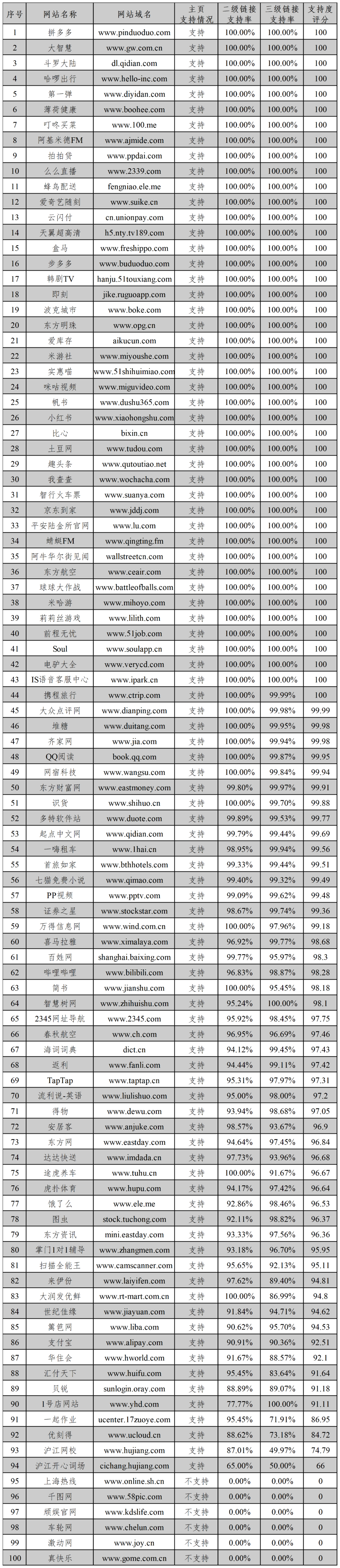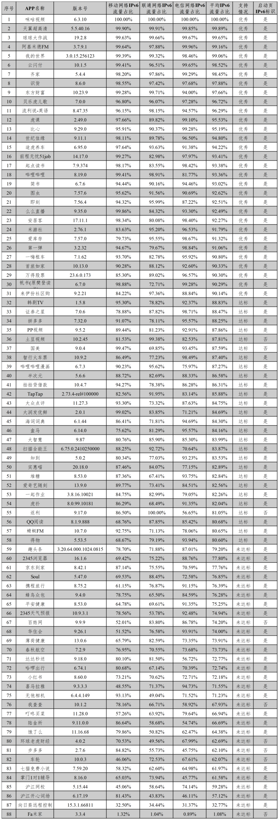 主要商业移动互联网应用(APP)IPv6支持情况测试结果