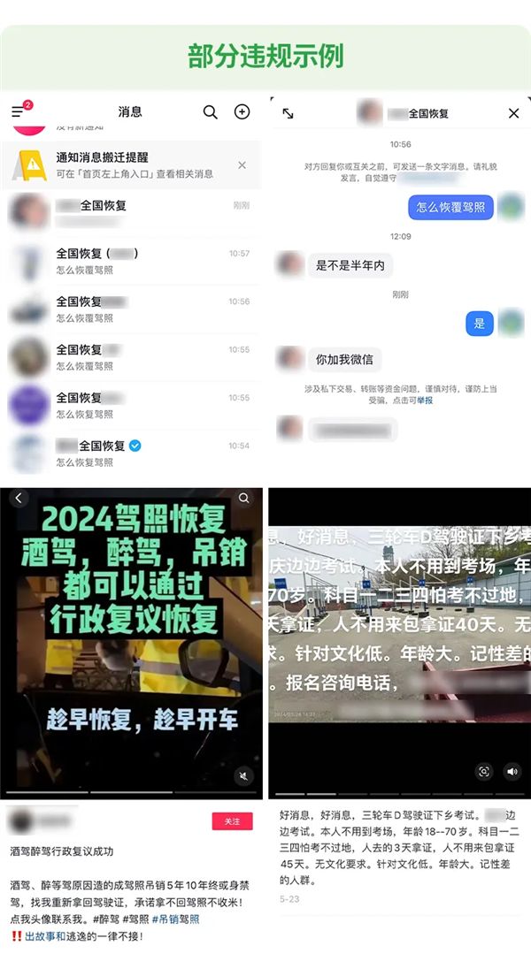 微信还曝光了恢复驾照诈骗手法、代考驾照诈骗手法。