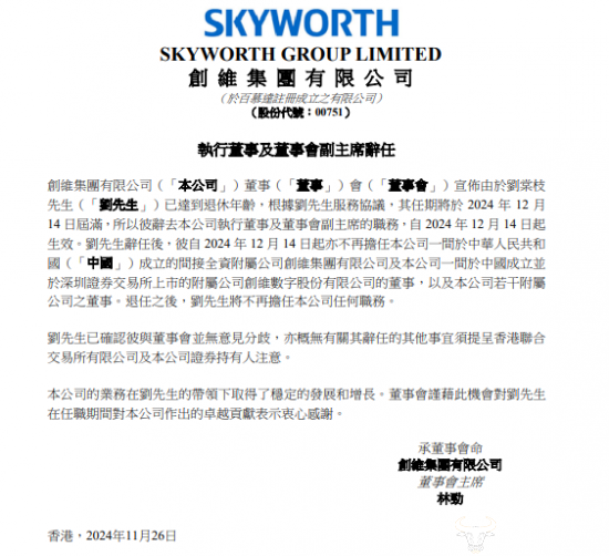 公告中表示,董事会副主席刘棠枝已达到退休年龄,根据服务协议,其任期将于2024年12月14日届满,所以辞去公司执行董事及董事会副主席的职务,辞任后将不再担任公司任何职务,自2024年12月14日起生效。