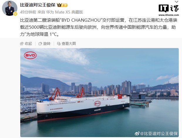 IT之家 12 月 2 日消息,比亚迪对公事业部总经理王俊保今日在微博上透露,比亚迪第二艘滚装船“BYD CHANGZHOU”交付即运营,在江苏连云港和太仓港装载近 5000 辆比亚迪新能源车后驶向欧洲。(滚装船:通过跳板采用滚装方式装卸载货车辆的“船舶”)