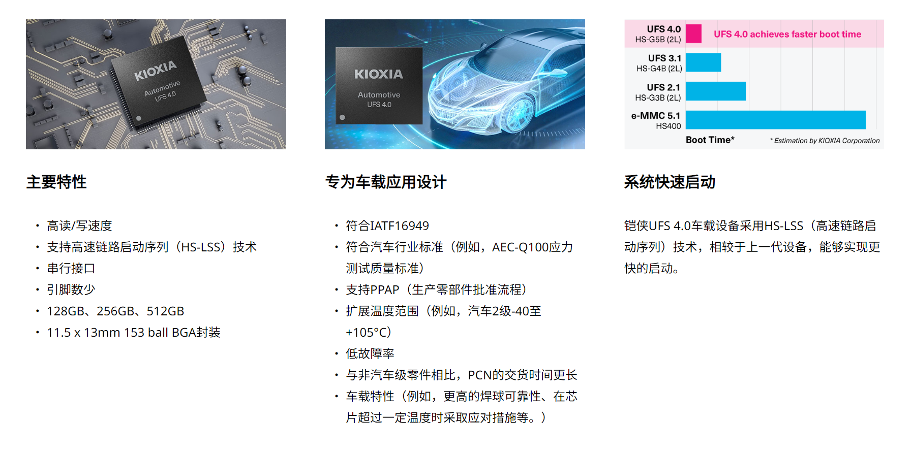 如果打开铠侠UFS 4.0介绍页面,就可以看到针对车规应用设计的认真标准,包括前面提到的IATF 16949,AEC-Q100应力测试质量标准,PPAP,工作温度符合2级-40℃到+105℃等更大范围。