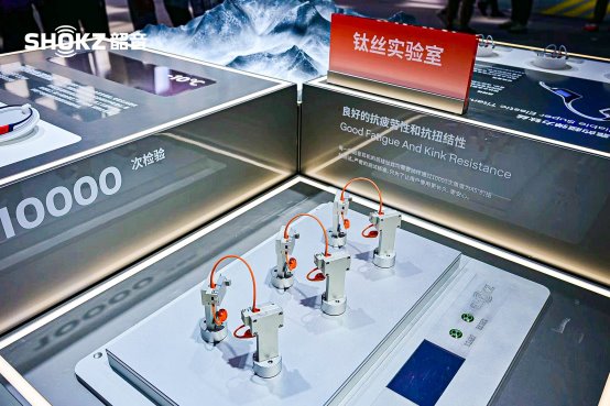 此次Shokz Lab运动实验室的科技展台,就是韶音佩戴科技的一次集中展示。展区内设置了“钛丝耐低温展示”、“钛丝可靠性测试装置”、“邵氏硬度计”等实验室装置,对韶音开放式耳机上使用的钛丝材料和硅胶材料进行了直观展示。