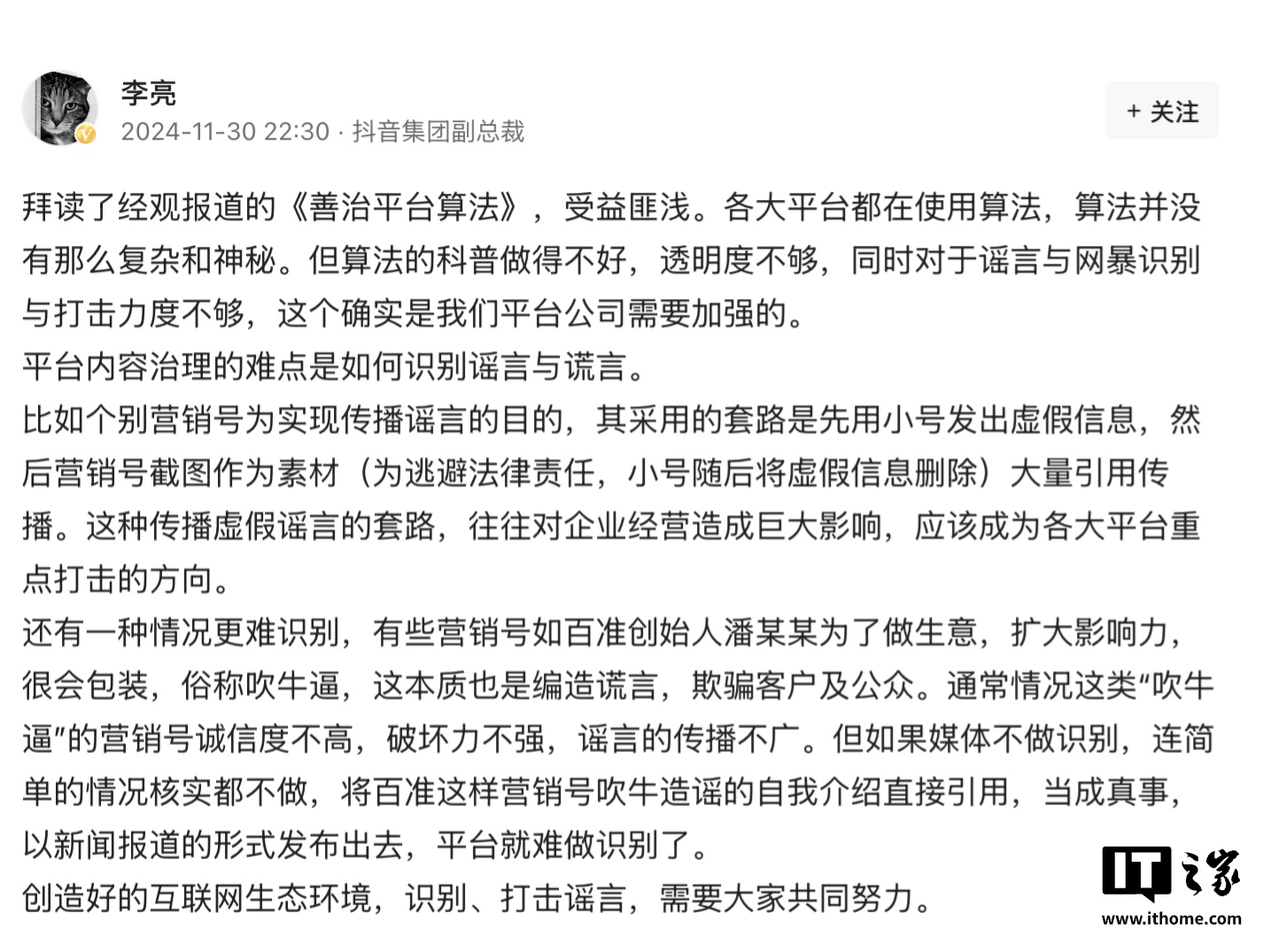 IT之家 12 月 2 日消息,抖音集团副总裁李亮上周末通过头条号撰文谈到了自己对“算法”的看法:“各大平台都在使用算法,算法并没有那么复杂和神秘。但算法的科普做得不好,透明度不够,同时对于谣言与网暴识别与打击力度不够,这个确实是我们平台公司需要加强的。”