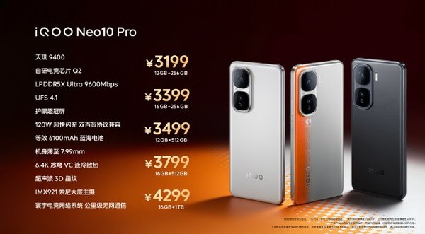 iQOO Neo10系列还带来了「护眼超冠屏」,其采用最新一代旗舰发光器件F1,搭载2592Hz全亮度高频调光,全亮度范围SVM 0.4,实现行业最低频闪,全高频最护眼。与此同时,它在颜色和价格方面同样颇具惊喜,提供了“拉力橙”、“驰光白”和“疾影黑”三种时尚配色供消费者选择。全系列发布即开售,其中iQOO Neo10 Pro的12GB+256GB版本到手价3199元起;而Neo10的12GB+256GB版本到手价仅需2299元起,现在购买还可参加以旧换新、限量加赠无线运动耳机、限量周边等等多重优惠活动,喜欢游戏电竞的小伙伴不妨多多关注。