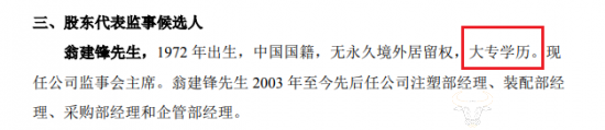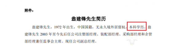 这份公告有一处奇怪的地方,在翁建锋的简历介绍部分提到了他的学历是本科学历。