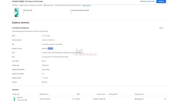 除了外观设计,Google Play Console还显示了荣耀X9c Smart的一些重要硬件规格。该设备搭载了安卓14系统,处理器方面采用了联发科的MT6855芯片,该芯片的主频为2.20 GHz,支持1080×2412像素分辨率的屏幕。值得注意的是,这款MT6855芯片实为联发科的天玑930处理器,而这款芯片于2022年第二季度发布,虽然该芯片的出现并不令人惊讶,但有分析指出,荣耀可能会选择搭载2023年第一季度发布的天玑7020处理器,后者其实是天玑930的升级版本。