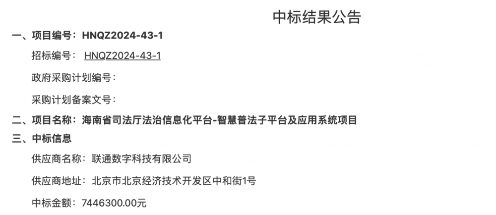 6月5日,项目公示了中标候选人,联通数字科技有限公司中标,中标金额744.63万元。