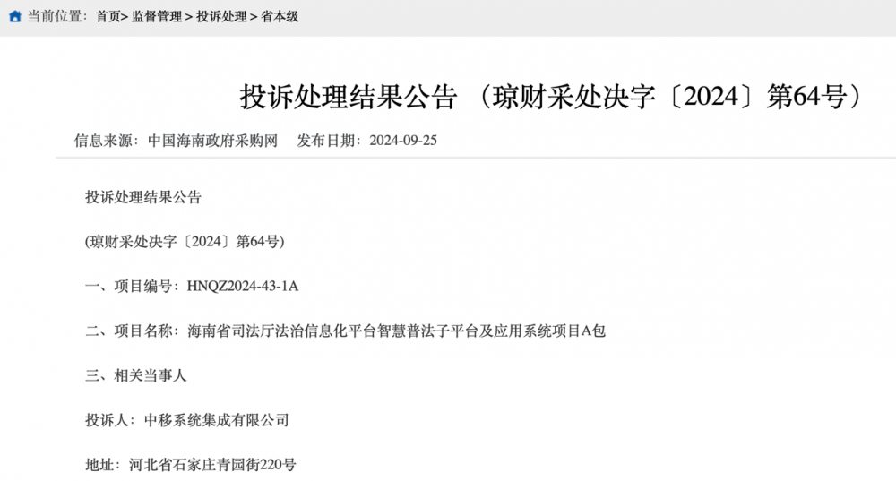 随后,该项目遭到中移系统集成有限公司投诉。