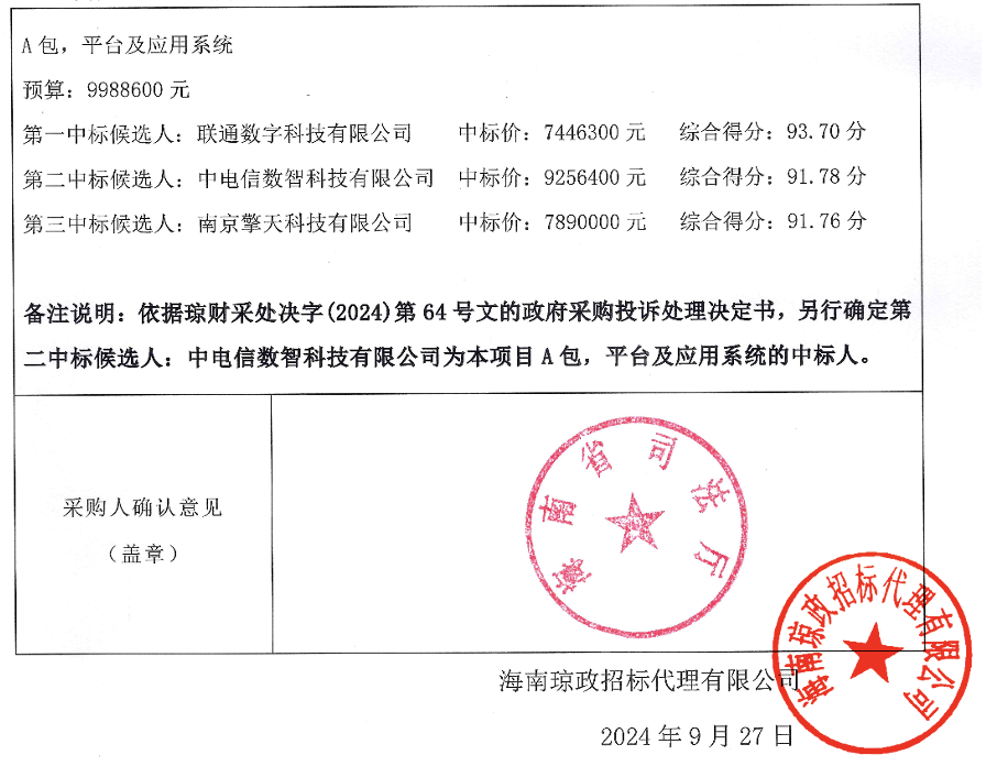 11月14日,该项目发布更正公告,联通数字科技有限公司被取消中标资格,原本第二中标候选人中电信数智科技有限公司惊喜“躺赢”,成为中标人,中标金额925.64万元。