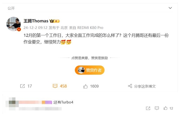 在评论区,有网友给出了答案:REDMI Turbo 4。