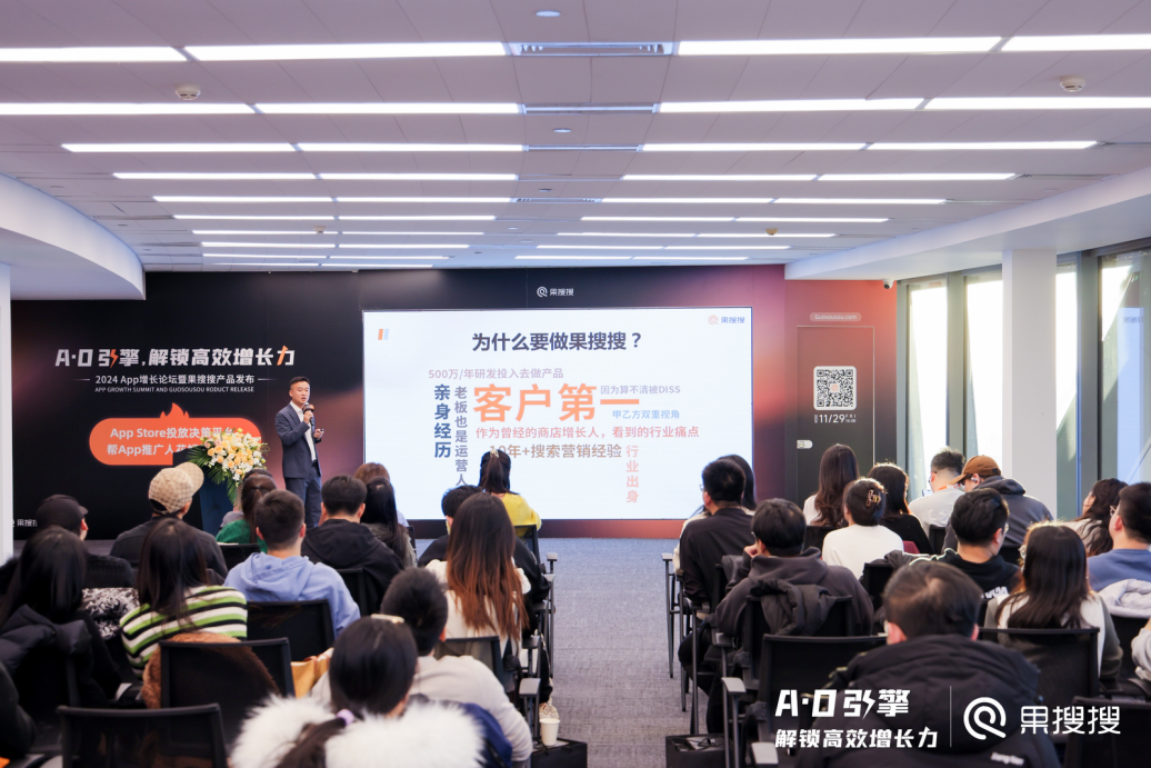 11月29日,“A·O引擎,解锁高效增长力——2024 App增长论坛暨果搜搜产品发布”活动在北京圆满举行。本次活动汇集媒体平台、品牌方与资深增长专家共同探讨App增长的前沿产品和推广策略,果搜搜也于现场正式发布了新升级「App Store 投放决策平台」,致力于帮App推广人花好每一分钱。