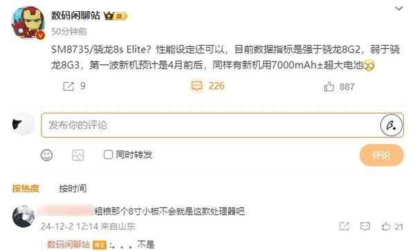 在评论区,还有网友询问,小米那款8英寸小尺寸平板会不会搭载骁龙8s至尊版,博主则表示“不是”。