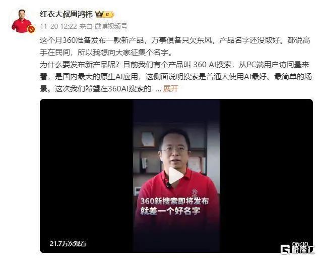11月20日,周鸿祎宣布360将发布新一代颠覆性AI搜索,并开启全网征名活动。