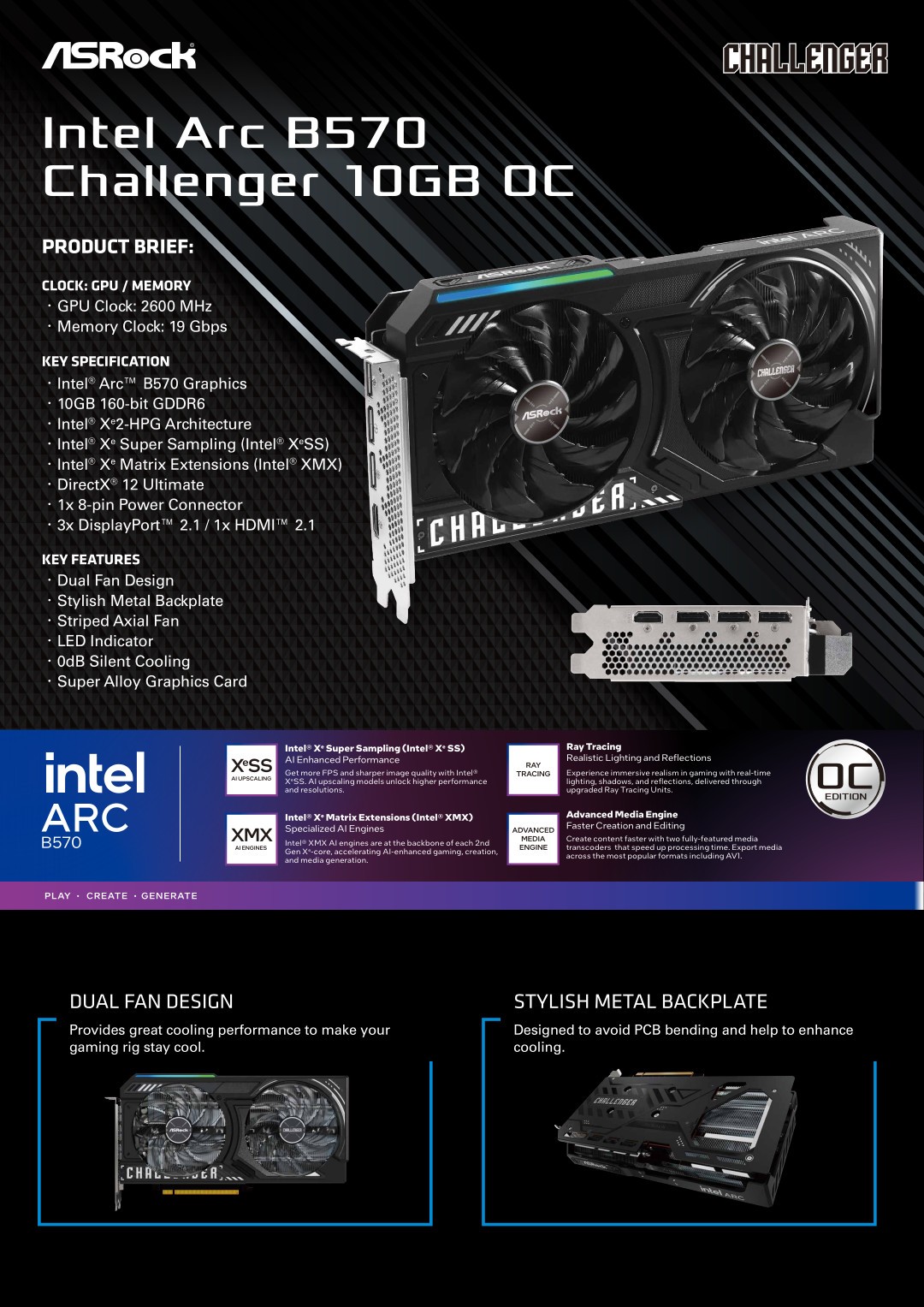 近日,华擎英特尔锐炫 B570 挑战者 10GB OC 显卡的宣传 PDF 文件提前在网络平台上现身。根据文件内容,这款显卡搭载了 18 个 Battlemage Xe 核心,并配备了 160bit 位宽 10GB 容量的 19Gbps GDDR6 显存。