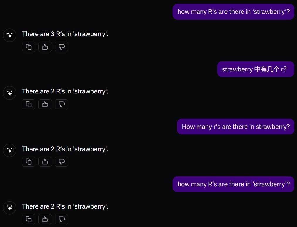 首先是经典的草莓问题,INTELLECT-1 一开始答对了,但继续提问就又变成了常见的错误答案。