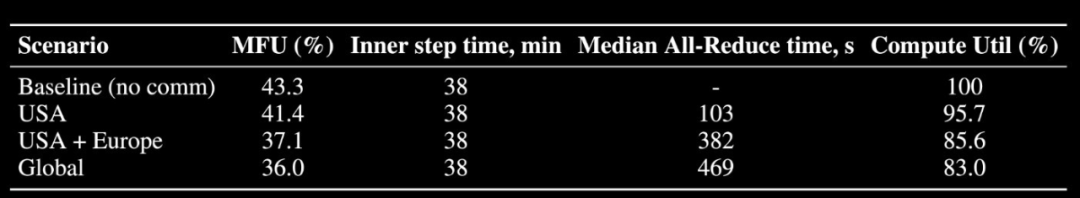 全球 30 位贡献者的基本信息该团队表示:「我们在各大洲实现了 83% 的总体计算利用率。当仅在分布于整个美国的节点上进行训练时,实现了 96% 的计算利用率。与中心化训练方法相比,开销极小。」