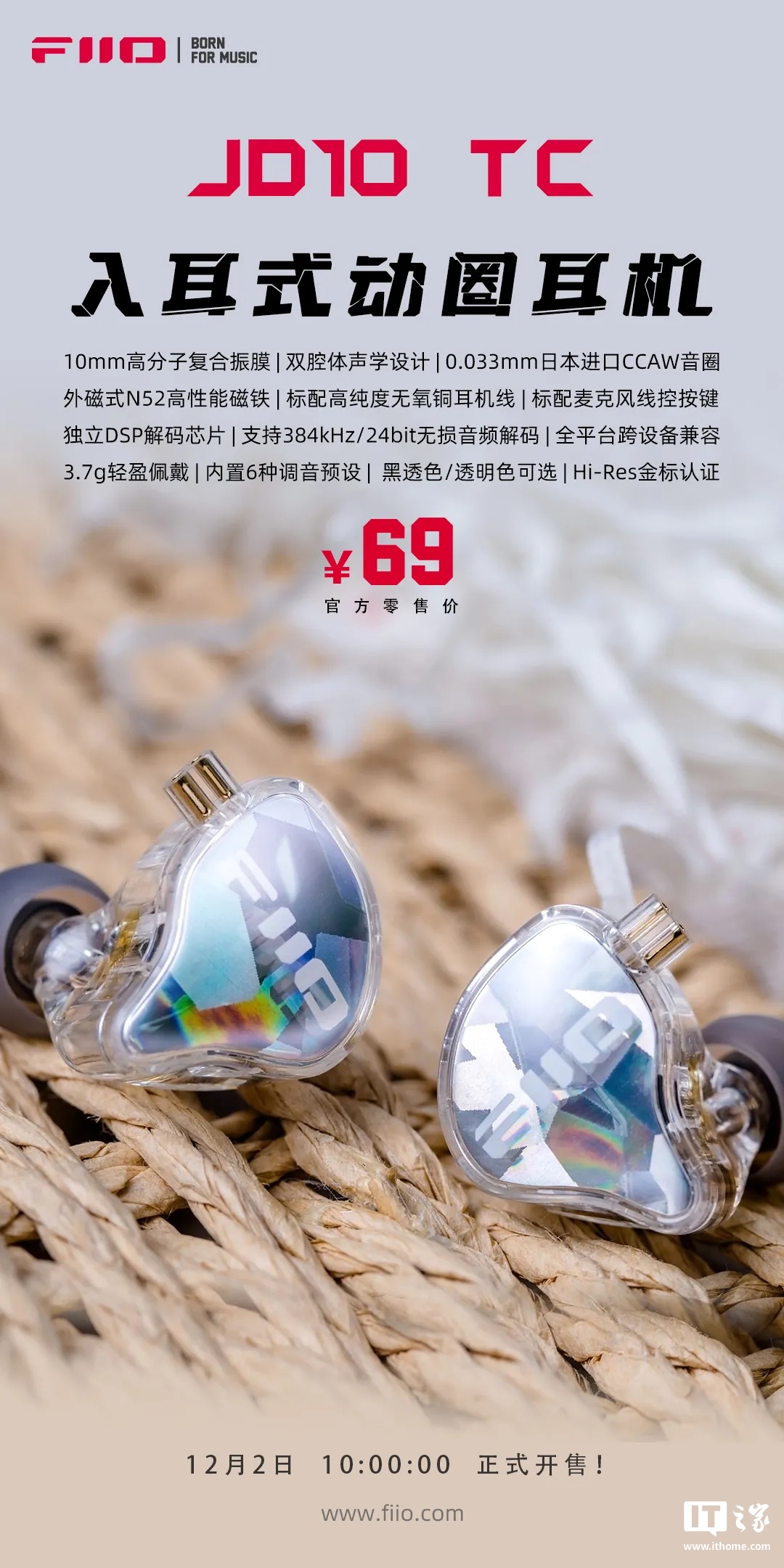 IT之家 12 月 2 日消息,飞傲 JD10 入耳式动圈耳机于 10 月 10 日开售,新增 Type-C 接口版本今日开售,售价 69 元。