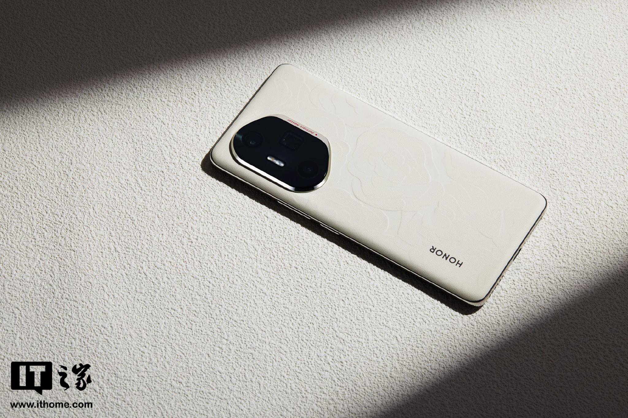 荣耀 300 采用了超薄小直屏设计;荣耀 300 Pro 以正面曲屏与背部曲线的“双曲”设计,搭配旷野舷窗 Deco,美感观感手感兼具;荣耀 300 系列还首次引入 Ultra 版本,其中荣耀 300 Ultra 山茶白配色带来了背部浮雕印花设计。