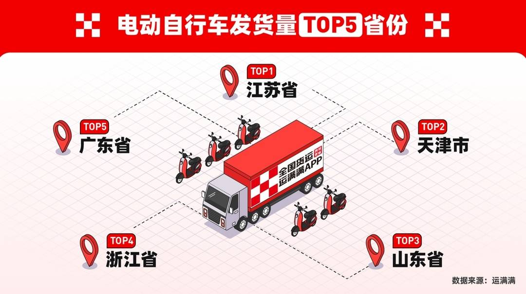 运满满数据显示,2024年1月1日-11月30日,电动自行车发货量前五名的省份分别为江苏、天津、山东、浙江、广东。可见,电动自行车产业基本集中在东部沿海地区。
