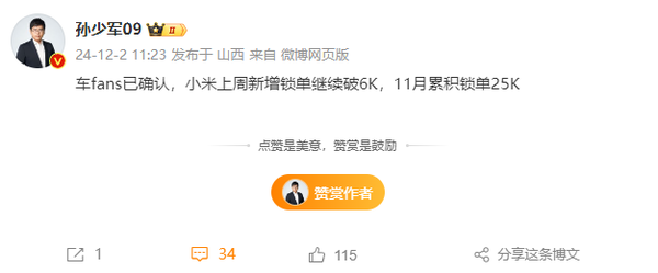 【CNMO科技消息】12月2日,CNMO注意到,车fans创始人孙少军透露,小米SU7上周新增锁单再次突破6000辆,11月累计锁单量已达25000辆。有网友对此表示,交付速度并未因订单增加而加快,反而积压的订单越来越多。