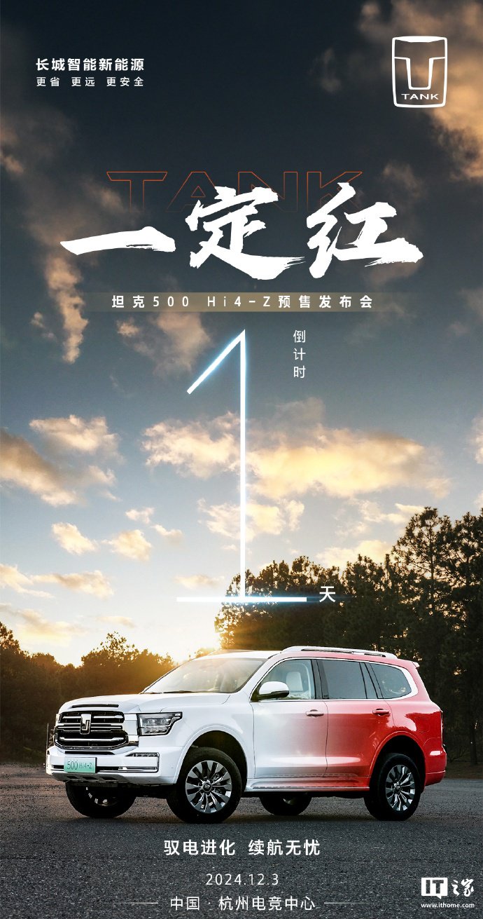 IT之家 12 月 2 日消息,长城汽车今日宣布坦克 500 Hi4-Z 预售发布会将于明日 17:55 举行,地点位于杭州电竞中心。
