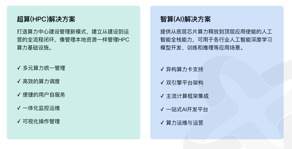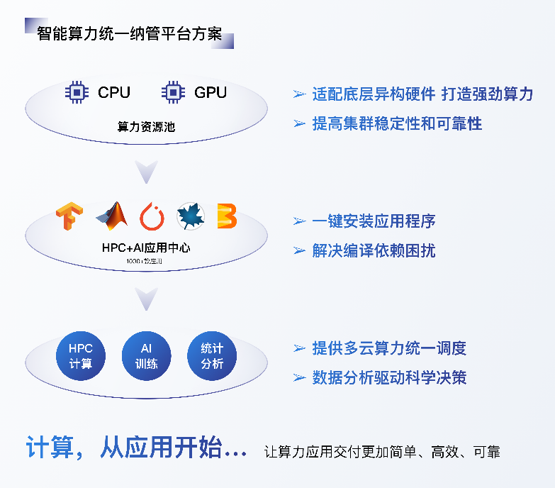 该方案适配底层异构硬件,高效利用CPU+GPU算力资源,提供多云算力统一调度,打造强劲算力,提高集群稳定性和可靠性,支持HPC AI应用一键安装,解决编译依赖困扰。通过统一的监控管理平台,为用户提供数据分析、统计分析、运营管控等。