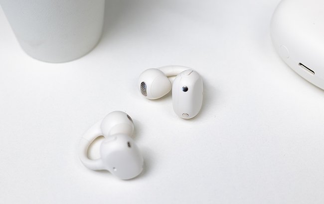 其实新款产品中“耳夹耳机”这个名称就能形象地概括整个产品的主要特征,它和普通入耳式耳机在形态上有很大的不同。一端是耳机的腔体,另一端则是充电触点,佩戴时只需夹在耳廓处,中间的C型桥采用了高弹记忆的镍钛丝材质,适用于不同耳型的使用者。单个耳机的重量5.2克,极大程度降低了耳机存在感,便携性出色,佩戴时不会有垂坠感。